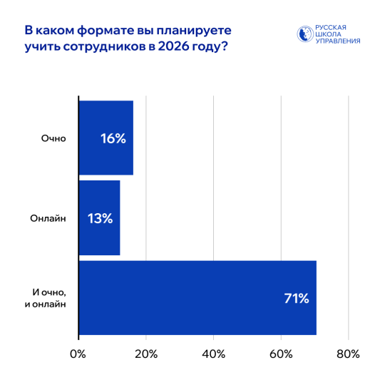 Кроме того, работодатели рассказали про особенности форматов и организации обучения в 2026 году. Смешанная модель — сочетание очного и онлайн-обучения — станет основным вариантом для 71% работодателей. Часть компаний будет использовать только очный формат (16%) или только онлайн (13%). При этом 67% компаний планируют совмещать внутреннее и внешнее обучение, 20% ограничатся внутренними ресурсами, а 13% выберут только внешние программы.