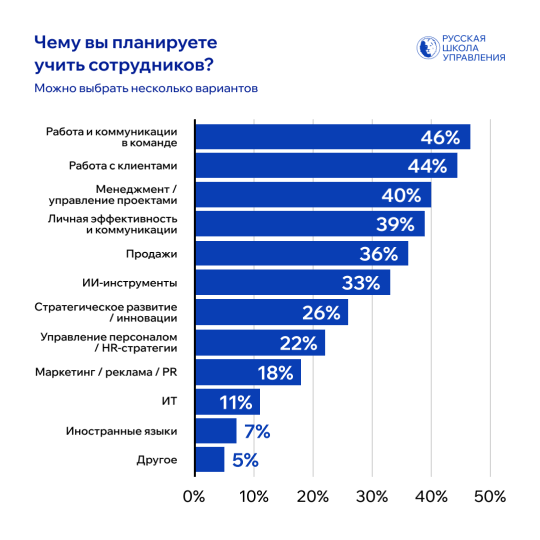 Продолжает расти интерес к технологиям: 33% компаний планируют обучать сотрудников использованию ИИ-инструментов. Кроме того, работодатели обращают внимание на темы стратегического развития (26%), HR-стратегии (22%), маркетинг, ИТ и иностранные языки.